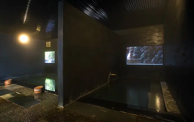 Mist rising up from the hot spring water fills the dimly lit bathroom to create a special atmosphere.